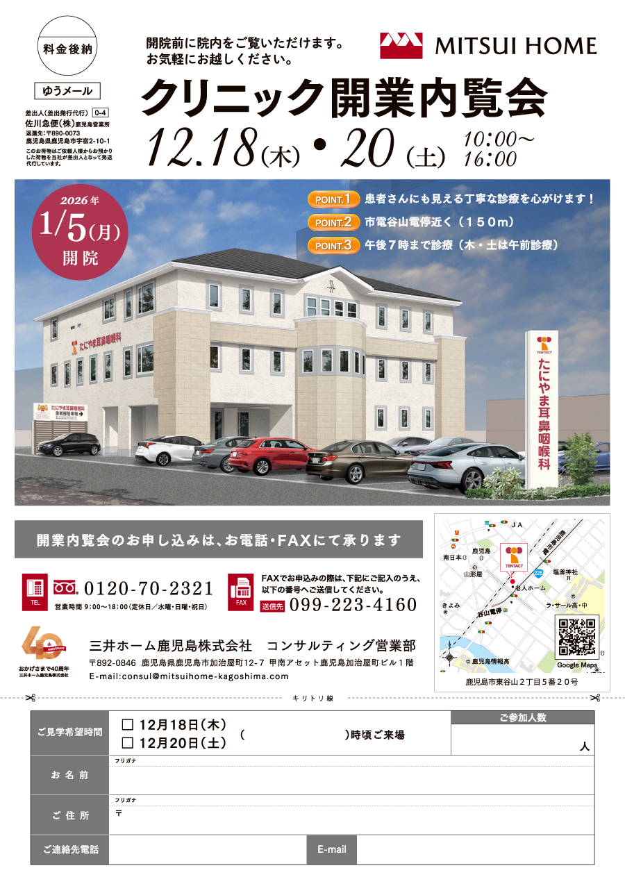 クリニック開業内覧会 12.18(木)、20(土) 10:00~16:00Event 開院前の院内をご覧いただけます。お気軽にお越しください。 会場:鹿児島市東谷山2丁目5番20号 日時:12月18日(木)、20日(土) 10:00~16:00 ①下記のボタンより問い合わせフォームへ移動ください。 ②ご参加希望イベントより『クリニック開業内覧会』を選択ください。 ③その他必須項目をご入力いただき、送信ください。 ④担当者から後ほどご連絡させていただきます。 上記チラシは、下の印刷ボタンより拡大できます。 ●お問い合せ・その他 三井ホーム鹿児島株式会社 TEL:0120-70-2321