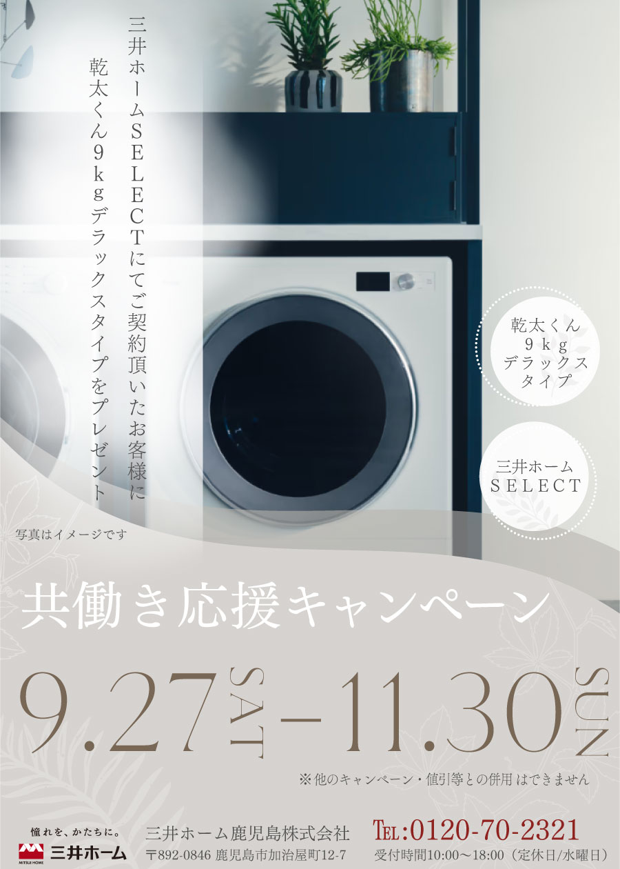 共働き応援キャンペーン 2025/9/27(土)~11月30(日) Campaign MITSUIHOME SELECTにてご契約いただいたお客様に乾太くん9kgデラックスタイプをプレゼント‼ 期 間:2025年10月27日(土)~11月30日(日) ※ 他のキャンペーン・値引等との併用 はできません ①下記のボタンより問い合わせフォームへ移動ください。 ②ご参加希望イベントより『共働き応援キャンペーン』を選択ください。 ③その他必須項目をご入力いただき、送信ください。 ④担当者から後ほどご連絡させていただきます。 上記チラシは、下の印刷ボタンより拡大できます。 ●お問い合せ・その他 三井ホーム鹿児島株式会社TEL:0120-70-2321 (営業時間/10:00~18:00 定休日/水曜)