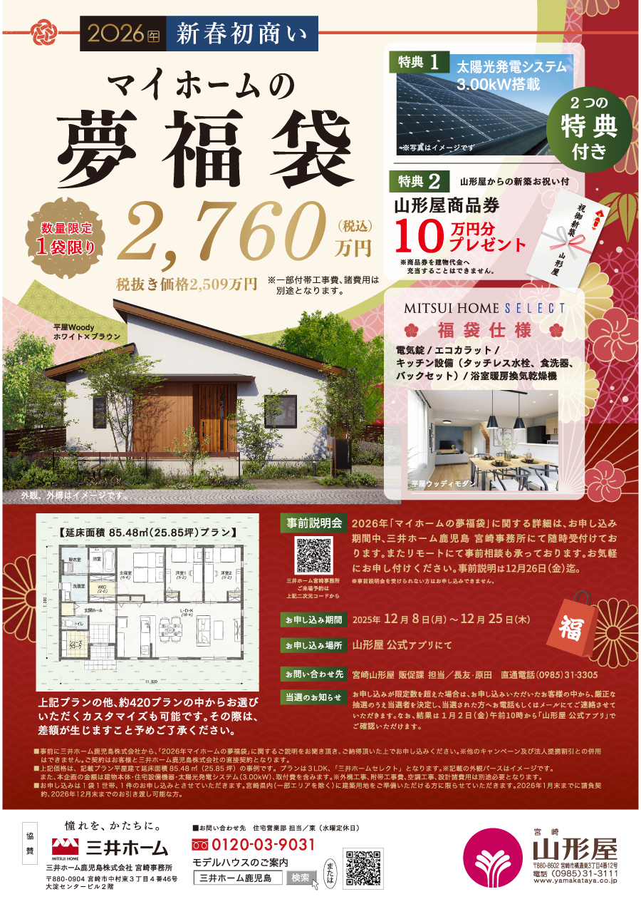 2026年「マイホームの夢福袋」に関する詳細は、下記のお申し込み期間中、三井ホーム鹿児島 宮崎事務所で随時、事前説明会を開催しております。またリモートでの事前相談も承っております。お気軽にお申し付けください。事前説明は12月26日(金)迄。