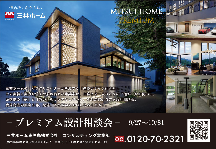プレミアム設計相談会 2025/9/27(土)~10/31(金)Event お客さま一人ひとりの"憧れ"をお伺いし、お客さまの「夢」と「想い」をカタチにします。 日程:2025年9月27日(土)~10月31日(金) 鹿児島県内限定3邸 参加費無料 / 完全予約制 ①下記のボタンより問い合わせフォームへ移動ください。 ②ご参加希望イベントより『プレミアム設計相談会』を選択ください。 ③その他必須項目をご入力いただき、送信ください。 ④担当者から後ほどご連絡させていただきます。 上記チラシは、下の印刷ボタンより拡大できます。 ●お問い合せ・その他 三井ホーム鹿児島株式会社 コンサルティング営業部TEL:0120-70-2321 - -