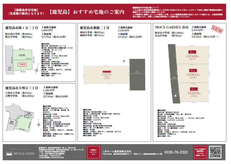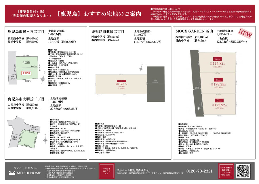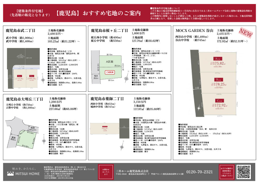 三井ホームの推奨宅地・分譲地情報Event 簡単!お問い合わせ ①下記のボタンより問い合わせフォームへ移動ください。 ②問い合わせしたい分譲地もしくは、おうちで家づくりオンライン相談を選択ください。 ③その他必須項目をご入力いただき、送信ください。 ④後日、スタッフからご連絡をさせていただきます。 上記チラシは、下の印刷ボタンより拡大できます。 ●お問い合せ・その他 三井ホーム鹿児島株式会社 TEL:0120-70-2321