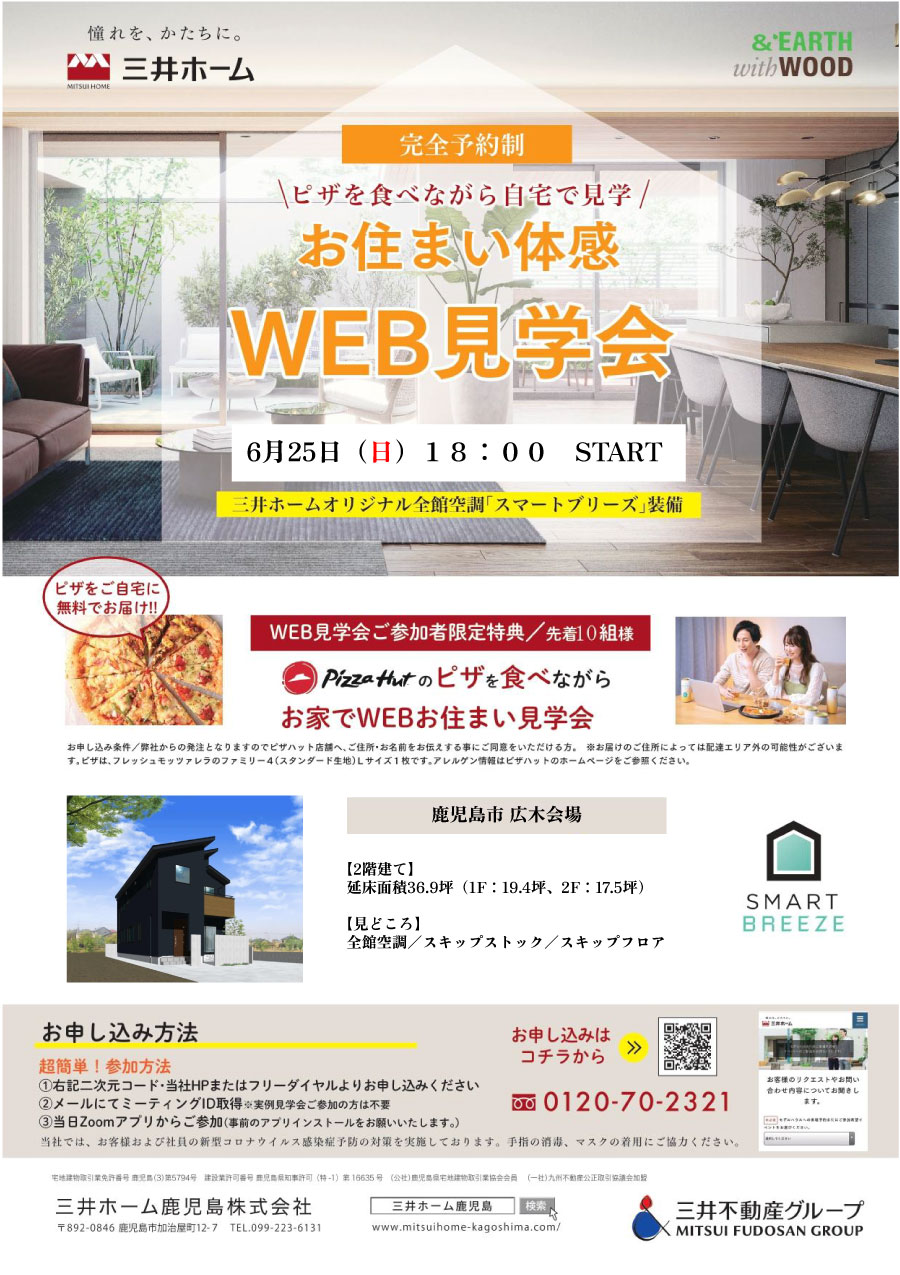 ピザを食べながら自宅で見学お住まい体感 WEB見学会 6月25日(日) 18:00~ Event お申込み条件/弊社からの発注となりますのでピザハット店舗へ、ご住所・お名前をお伝えする事にご同意いただける方。※お届けのご住所によっては配達エリア外の可能性がございます。※ピザは、フレッシュモッツァレラのファミリー4(スタンダード生地)Lサイズ1枚です。アレルゲン情報はピザハットのホームページをご参照ください。 ●お問い合せ・その他 三井ホーム鹿児島株式会社 鹿児島営業所TEL:099-223-6131