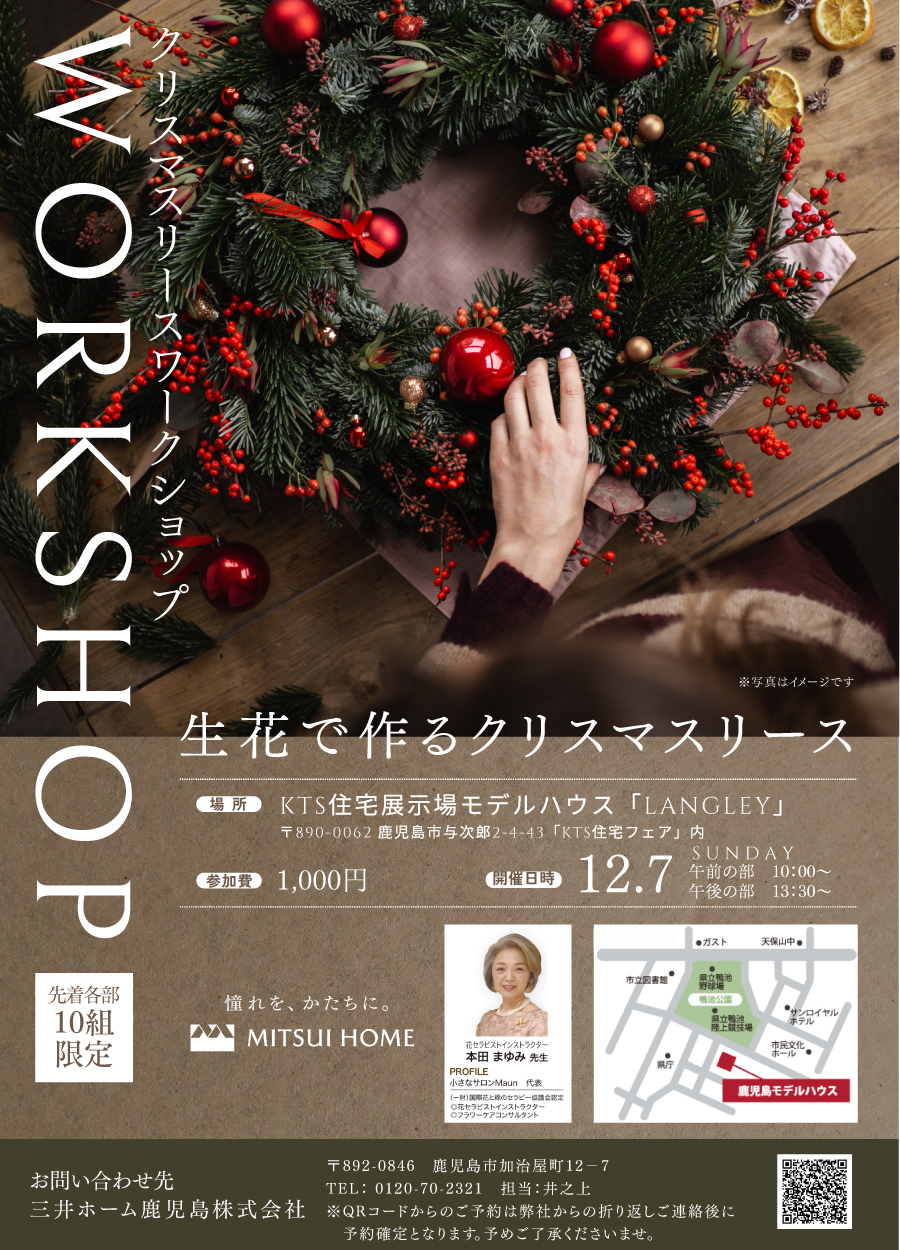 生花で作るクリスマスリース ワークショップ12月7日(日) 10:00~、13:30~Event 会 場:KTS住宅展示場モデルハウス「LANGLEY」 〒890-0062 鹿児島市与次郎2-4-43「KTS住宅フェア」内 日 時:12月7日(日)午前の部10:00~、午後の部13:30~ 参加費:1,000円 講 師:花セラピストインストラクター 本田まゆみ先生 本イベントのお申込は、ご応募多数につき終了させていただきました。 完全予約制 上記チラシは、下の印刷ボタンより拡大できます。 ● お問い合せ・その他 三井ホーム鹿児島株式会社 TEL:0120-70-2321(井之上)